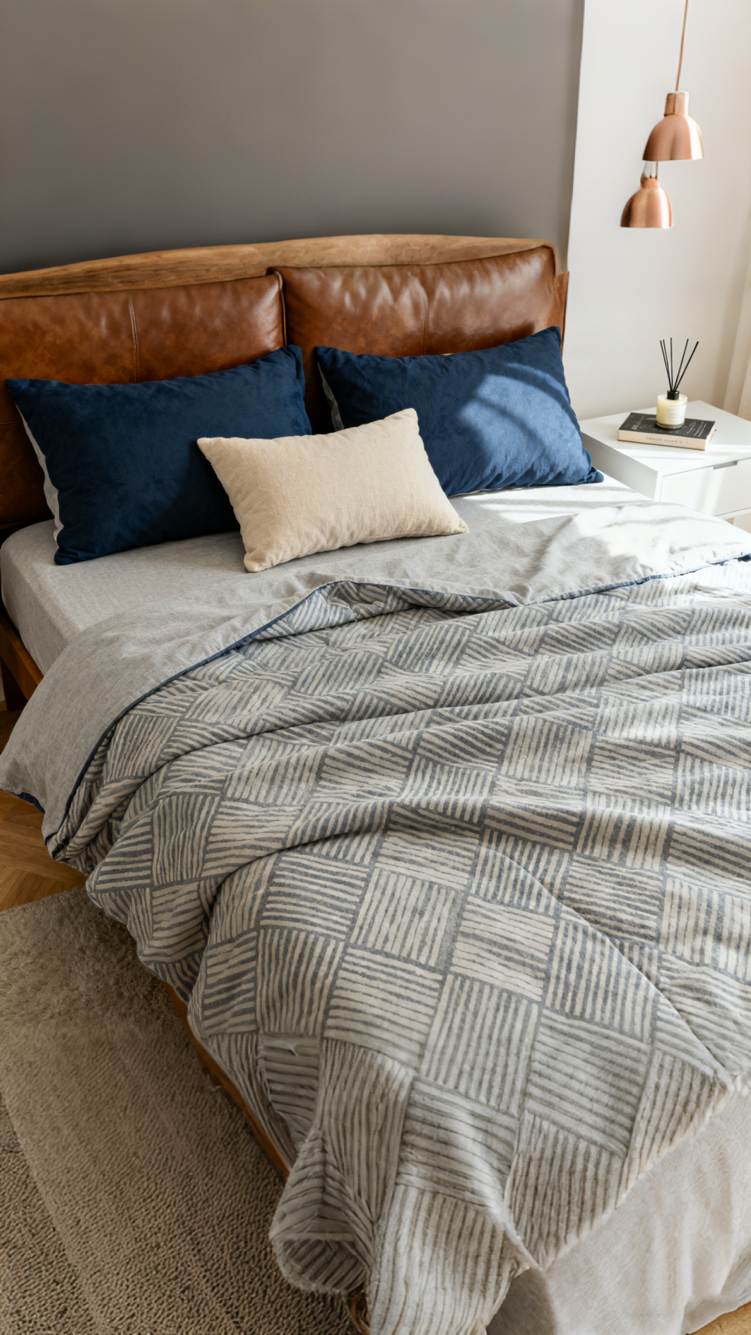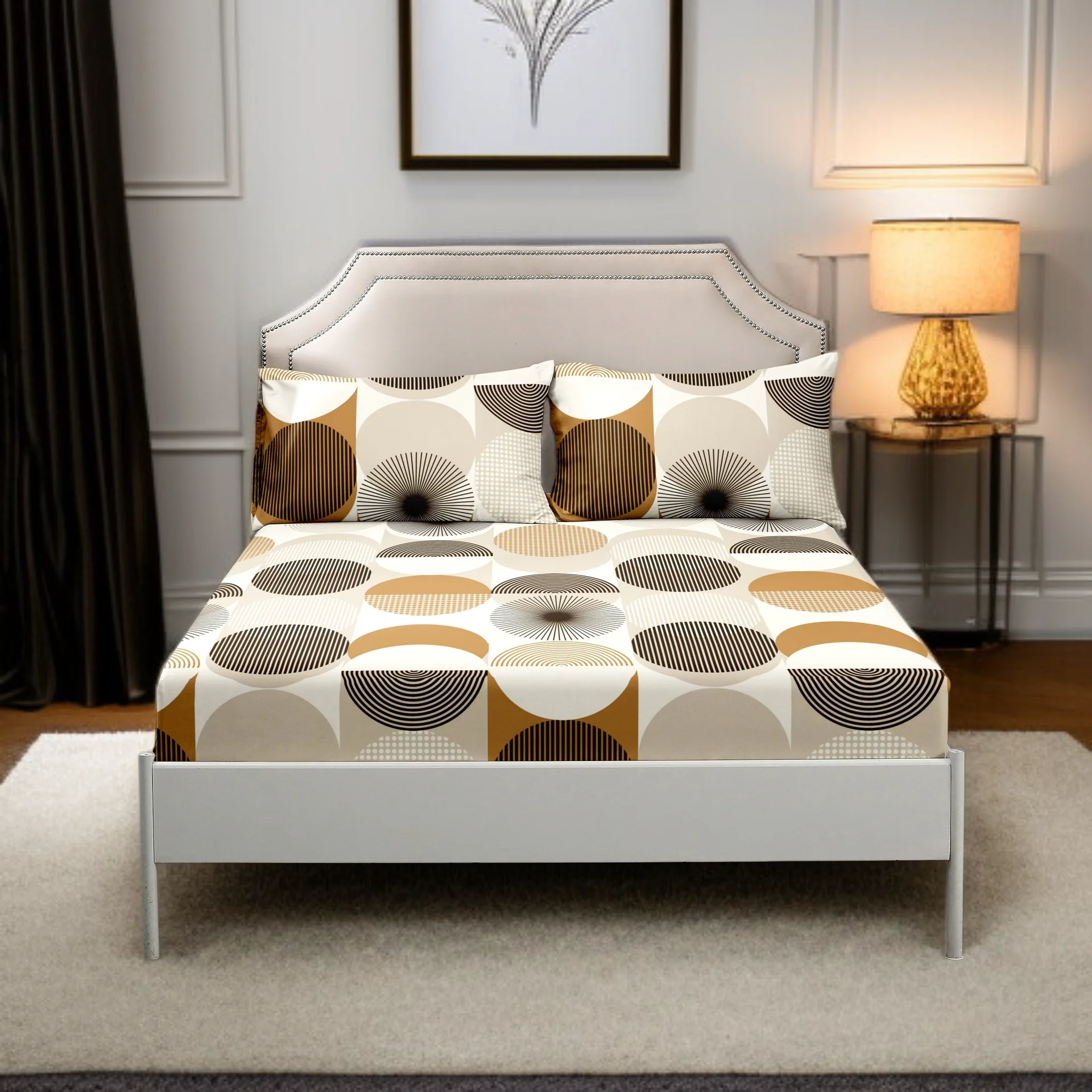 柔らかくて快適な、ライトベージュの幾何学模様の大人用フィットシーツ寝具セット。